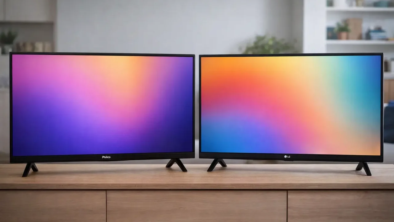 A principal diferença está na qualidade de áudio e conectividade da Philco, em contraste com o design moderno e funções smart da LG.