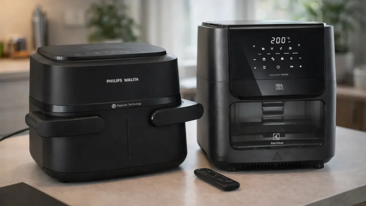 A Philips aposta em dois compartimentos independentes com tecnologia RapidAir e sincronização. Já a Electrolux combina formato oven, função 5 em 1 e painel digital com aviso para virar.