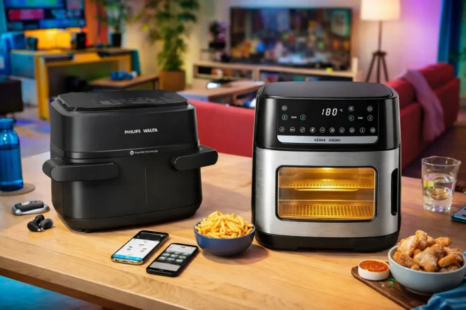 Nos extras que pesam na rotina, a Walita Série 5000 inclui 2 grelhas, 1 coletor de gordura e 1 cesto de airfryer com pegador removível. A Walita Série 1000 menciona grelha removível, mais de 700 receitas no App HomeID e a possibilidade de sincronizar os dois compartimentos para terminar tudo junto. Em resumo, a Série 5000 entrega mais itens físicos no conjunto, enquanto a Série 1000 cede menos para quem quer fluxo de preparo dividido e coordenado.