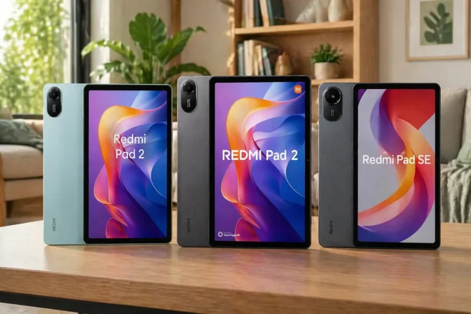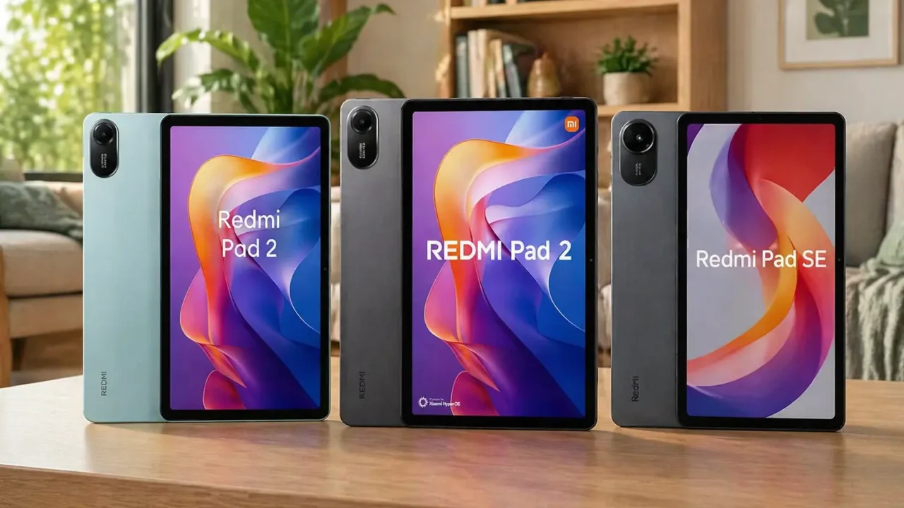 As opções incluem o Xiaomi Redmi Pad 2 8GB/256GB (Verde), o Xiaomi Redmi Pad 2 11″ 8GB/256GB (Cinza) e o Xiaomi Redmi Pad SE 11″ 8GB/256GB (Cinza)