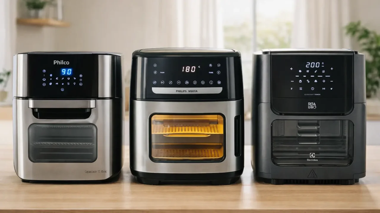 Entre essas quatro air fryers forno 12L, a escolha fica mais clara quando você parte do uso que pretende dar ao aparelho: funções prontas, variedade de acessórios, modos de preparo ou preparo simultâneo em mais de uma assadeira. Este texto foi organizado apenas com base no material fornecido de cada produto, mantendo o foco no que está descrito em cada item.