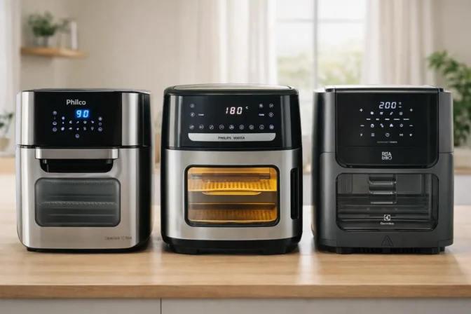 Escolher uma air fryer forno de 12 litros parece simples, mas a decisão muda bastante quando você observa o tipo de preparo, os acessórios incluídos e a forma de uso no dia a dia. Na prática, alguns modelos apostam em painel com funções prontas, outros trazem mais bandejas ou recursos voltados à visualização e à rotina da casa.