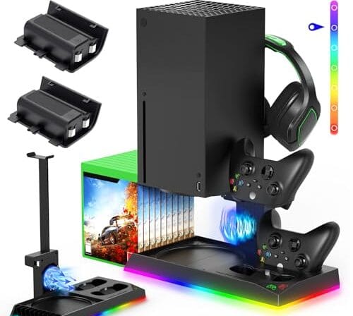 Acessório multifuncional para Xbox Series X】O suporte vertical mantém seu console, controladores, fones de ouvido e jogos organizados. A parte inferior do suporte de resfriamento é feita de metal com almofada antiderrapante, o que é mais seguro para colocar seu console. Também vem com 2 pilhas recarregáveis de 1400 …
