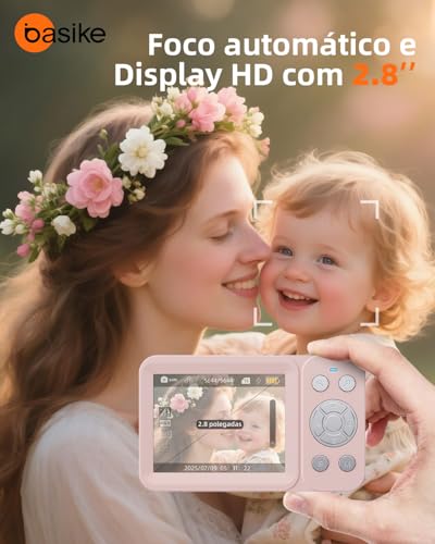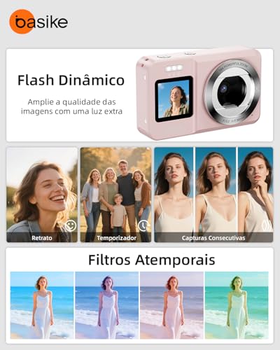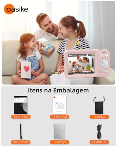 Basike Câmera Fotográfica Digital 4K UHD 64MP, Zoom 18X, Tela Dupla com Flash, Foco Automático e Time-Lapse, para Iniciantes, Jovens e Viagens, Compacta, Criativa e Portátil – Rosa