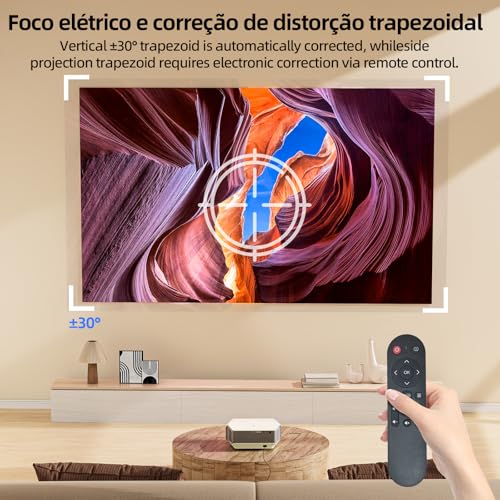 • Foco Eletrônico e Correção de Keystone de ±30: Projetor 4k incrível! Com foco eletrônico preciso e rápido, Correção trapezoidal de ±30 graus. Escolha este data show e tenha uma experiência visual única. Quando você move o mini projetor, você só precisa esperar de 1 a 3 segundos para que o projetor foque automaticamente e restaure uma imagem nítida.A correção Keystone permite que você coloque seu projetor portátil em qualquer lugar, mantendo uma imagem perfeitamente retangular.