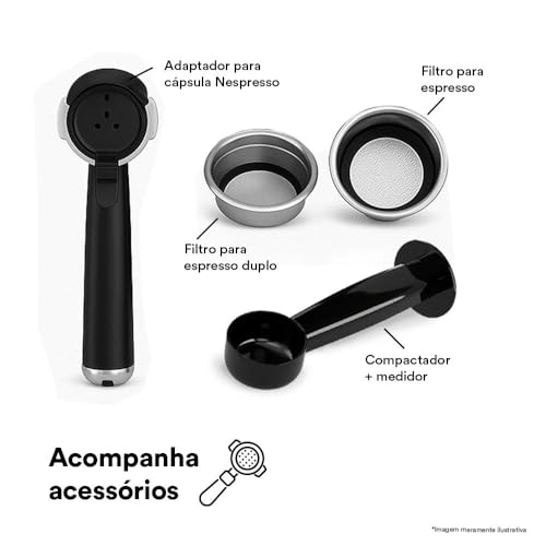 Tipo de Café Utilizado: Café Moído, Cápsulas e Sachê • Pressão de Funcionamento: Pressão da Bomba 20 (bar) • Funções: Preparo de Espresso, Cappuccino, Latte e Vaporização de Leite