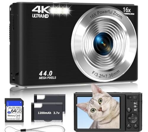 Câmera digital 4K, câmeras pretas de atualização para adolescentes, câmera digital de foco automático para crianças com zoom de 16X, cartão SD de 64 GB, câmera pequena compacta para meninos, meninas