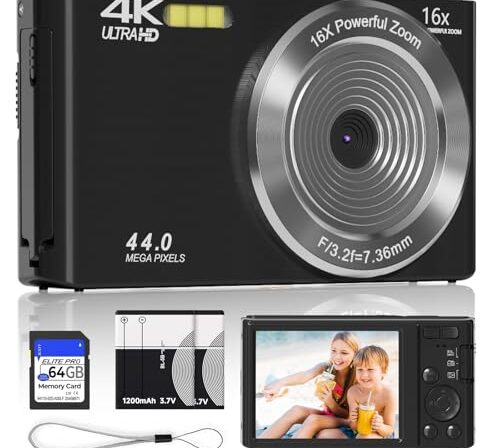 Câmera digital 4K para adolescentes com foco automático de zoom de 16x, câmera digital pequena e compacta portátil para meninos/meninas com cartão SD 64G, 2 baterias (preto)