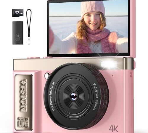 Câmera digital 4K rosa para meninas adolescentes: Câmera vlogging de 64 MP com tela flip – Zoom de 16X – Câmera compacta fofa para fotografia e YouTube – Presente estético de apontar e fotografar para