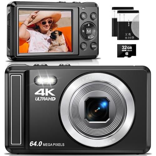 Câmera Digital 4K,Fotográfica para Vlog 64MP, Foco Automático, Zoom 16X,Tela IPS de 2.8 Polegadas para fotografia, Flash, Cartão SD de 32GB, Câmera Compacta,para Crianças e Adolescentes