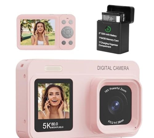 Câmera digital de tela dupla 5K atualizada – com alta resolução de 5K80MP, tela dupla, foco automático, zoom digital de 18x, função de beleza facial e flash integrado • Design de tela dupla – tela frontal de 3,8 cm, tela traseira de 7,3 cm, fácil de tirar selfies e evitar problemas ao tirar selfies. • Câmera de zoom…