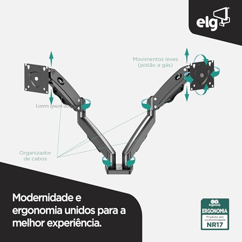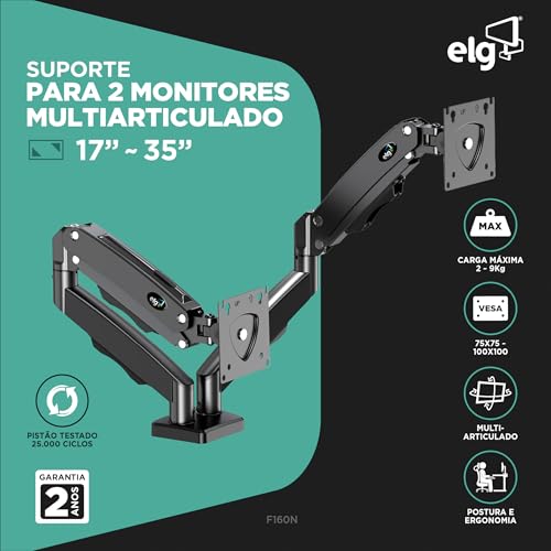 ELG, F160N, Suporte Articulado de Mesa com Pistão a Gás e Ajuste de Altura, 2 Monitores de 17” a 35”, Com Organizador de Cabos, Capacidade de 2kg a 9kg, Preto
