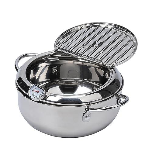Elvaesther Frigideira Tempura Frigideira 304 Aço Inoxidável Fundo Plano Fogão Estilo Japonês com Tampa e Termômetro de Controle de Temperatura 304 # 20 cm fritadeira