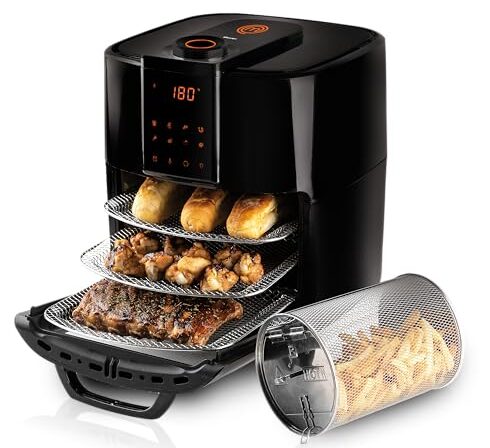 • Conta com 6 acessórios, umas das mais completas das categorias. 3 grelhas: para preparar vários alimentos ao mesmo tempo 1 bandeja: 2 em 1 coletora de gordura e assadeira. Cesto Rotativo: Assa e frita por igual, deixa tudo super crocante. Pegador: para garantir a segurança necessária para retirada do cesto rotatório.