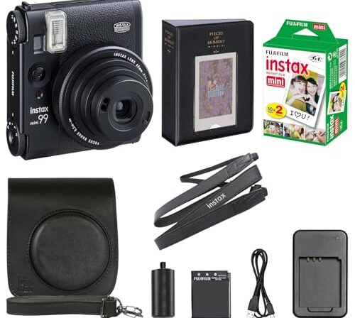 Fujifilm Câmera instantânea Instax Mini 99 com estojo de transporte + filme Fuji Instax Pacote econômico (20 folhas) Pacote de acessórios (preto)