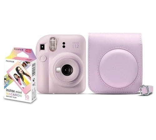 Kit Câmera Instax Mini 12 com pack 10 fotos Macaron e Bolsa Lilás Candy