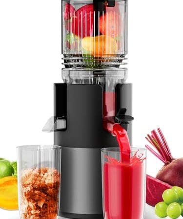 • Potentes máquinas de espremedor a frio: com uma calha de autoalimentação grande de 13,5 cm para frutas inteiras, é um espremedor de mastigação lenta. Seu motor de 300 W funciona a 50 rpm mastigando lentamente em uma operação silenciosa, atingindo 89% de rendimento de suco (verificado), o fabricante de suco de vegetais perfeito para a saúde diária da família e reuniões alegres