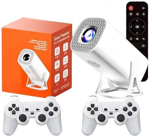 Mini projetor 1080p suporta 4K, projetor de jogos com controladores, console de jogos retrô – projetor de jogos com 2 controles sem fio, suporte para mais de 36.000 jogos (estilo de jogo)