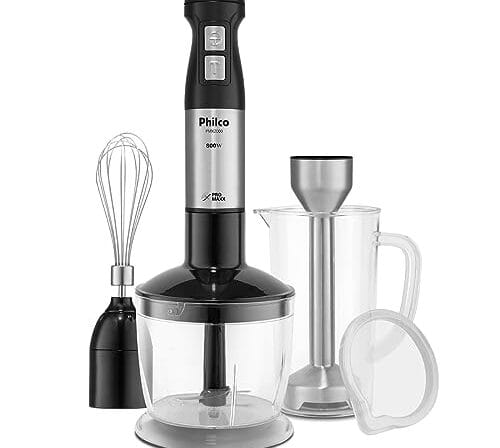 3 em 1 – Mixer, processador e batedor que proporcionam mais autonomia e versatilidade na cozinha • 4 lâminas em inox – Duas grandes e duas pequenas que garantem maior resistência e durabilidade. • 800W – Potência ideal para otimizar o preparo de receitas