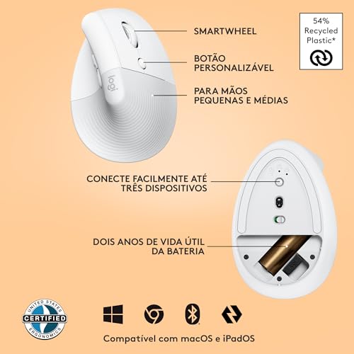 Mouse Sem Fio Logitech Lift Vertical com Design Ergonômico para Redução de Tensão Muscular, Cliques Silenciosos, Conexão Bluetooth ou USB Logi Bolt, Compatível com Windows/macOS/iPadOS – Branco