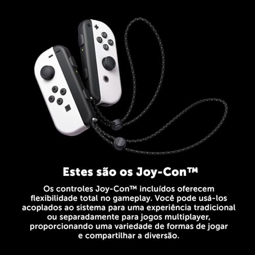 • TELA OLED BRILHANTE PARA JOGOS IMPERDÍVEIS. Inclui o Nintendo Switch OLED branco com controles Joy-Con. Aproveite a tela OLED de 7 polegadas para cores vibrantes e uma experiência imersiva, seja no modo portátil ou conectado à TV.