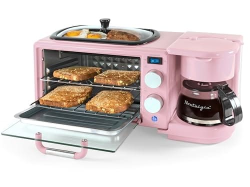 Nostalgia Estação de café da manhã retrô 3 em 1 – inclui cafeteira de 5 xícaras, chapa de cerâmica antiaderente e forno de torradeira de 4 fatias – temporizador embutido, filtro de café reutilizável