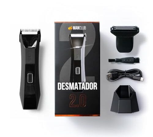 O Desmatador 2.0 da MANCLUB – Aparador elétrico de pelos corporais: 1 lâmina à prova de cortes + 1 lâmina de finalização | À prova d’água | 90 minutos de uso | Base carregadora e indicador de bateria