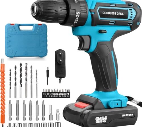 Seja o primeiro a avaliar “Parafusadeira e Furadeira à Bateria 21V com 2 Baterias e Carregador, 2 Velocidades Variáveis, Luzes LED, Kit de 25 Acessórios e Maleta, Conjunto Completo para Perfuração e Parafusamento, Azul”