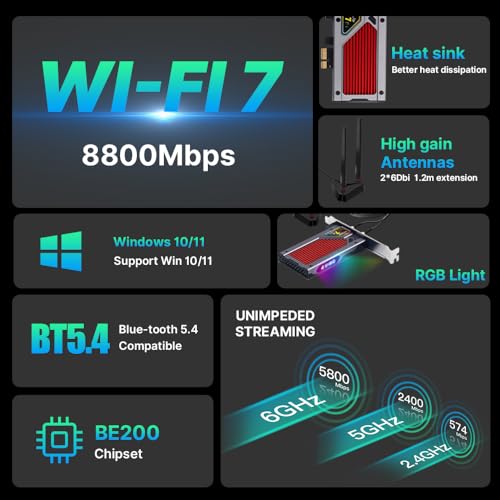 • Este cartão WiFi PCI-E com luz RGB Fenvi WFi 7 BE200 traz WiFi para 6GHz, atualizando WiFi para banda tripla. Utilizando os modelos mais recentes padrão Wi-Fi 7, Tri-Band (2,4 GHz, 5,8 GHz, 6 GHz) estão disponíveis. Velocidade máxima de até 8774Mbps 2,4GHz @574Mbps, 5GHz@2400Mbps, 6GHz (320MHz)@5800Mbps.