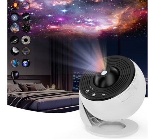 • PROJECTOR DE CONSTELAÇÃO 12 EM 1: A luz do projetor de estrelas vem com 12 tabuleiros de filme com conteúdos diferentes: Galáxia, Sistema Solar, Terra, Lua, Via Láctea, Galáxia de Andrómeda, NGC4302-NGC4298, Campo Profundo do Hubble, M60-UCD1, Nebulosa da América do Norte, Montanha Mística e Pequena Nuvem de Magalhães. Pode mudar estes diapositivos em diferentes cenas. Perfeito para a decoração do quarto de crianças, adolescentes e adultos.