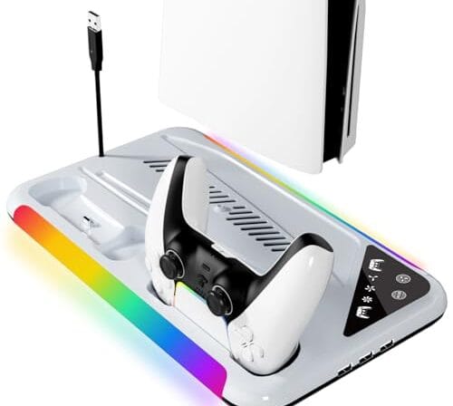 RGB Base Carregador Cooler Para PS5/ PS5 Slim Suporte Controles, com 2 Carregador Controle Bateria 600mah