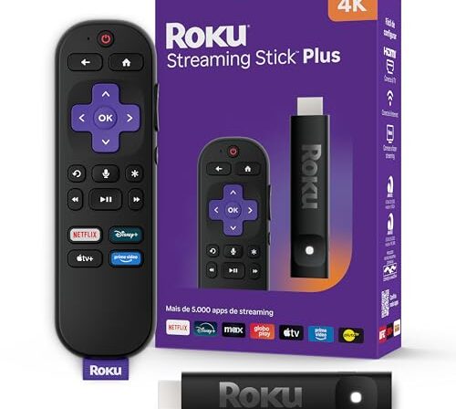 Roku Streaming Stick Plus 4K 2025 | Dispositivo de streaming para TV 4K com controle remoto por comando de voz compatível com Alexa, Siri e Google