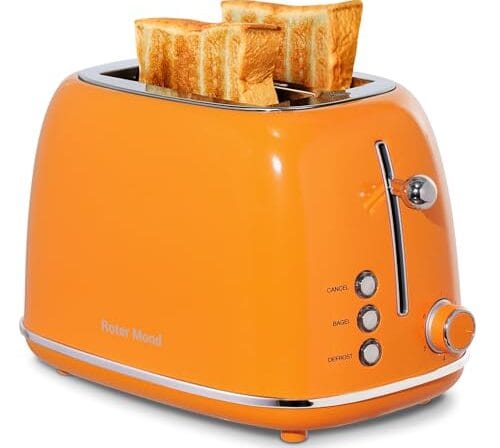 Roter Mond 2 Slice Toaster Retro Stainless Steel with Bagel, Cancel, and Defrost Functions, 6 Bread Shade Settings, Extra Wide Slots and Removable Crumb Tray, Orange