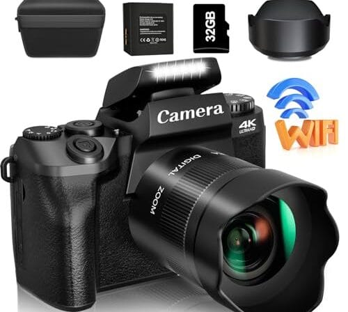 Saneen Digital Camera, 4k Cameras for Photography & Video, 64MP WiFi Touch Screen Vlogging Camera for YouTube with Flash, 32GB Card, Lens Hood, 3000mAH Battery, Front and Rear Cameras –