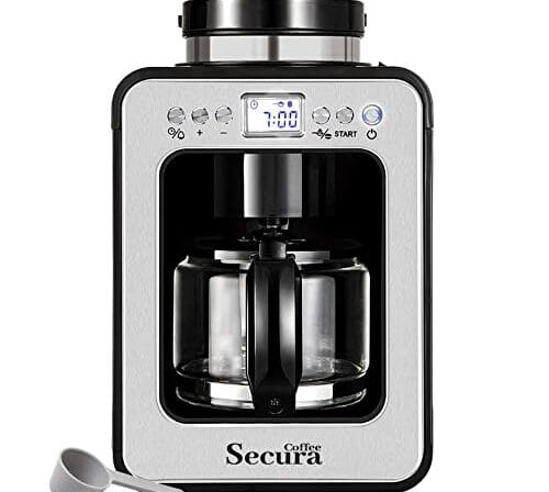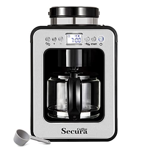 Secura Coffee Máquina de café automática com moedor, moagem programável e máquina de café para uso com grãos moídos ou inteiros, frasco de vidro de 482 g