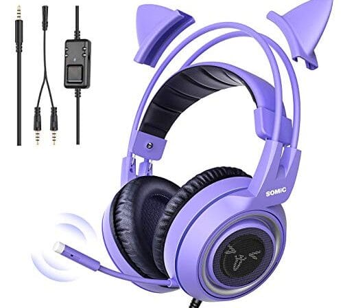 SOMIC G951S Fone de ouvido estéreo roxo para jogos com microfone para PS4, PS5, Xbox One, PC, telefone, orelhas de gato destacáveis, fones de ouvido com redução de ruído de 3,5 mm,
