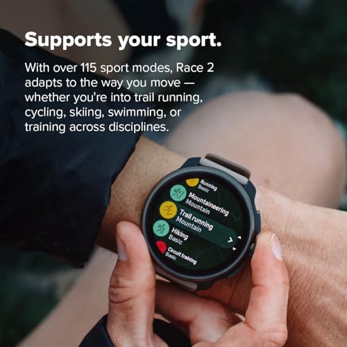 • Race 2 é feito para apoiar você em todas as fases: desde treinamento estruturado até corrida, recuperação e vida cotidiana. Com mais de 115 modos esportivos, ele se adapta à maneira como você se move – seja correndo trilhas, ciclismo, esqui, natação ou misturando