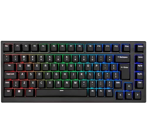 – Teclado com os switches Akko Silver V3 Pro • – Teclado 75% para quem deseja aumentar o espaço na mesa sem grandes limitações • – Layout ABNT2, para aqueles que não abrem mão do layout brasileiro