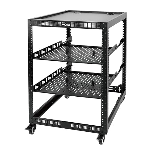 TECMOJO Rack de rede de estrutura aberta 16U para equipamentos de TI e AV, rack AV de 4 pinos com rodízios, rack móvel de 16 U com 2 peças, prateleira de rack de servidor 1U e hardware de montagem